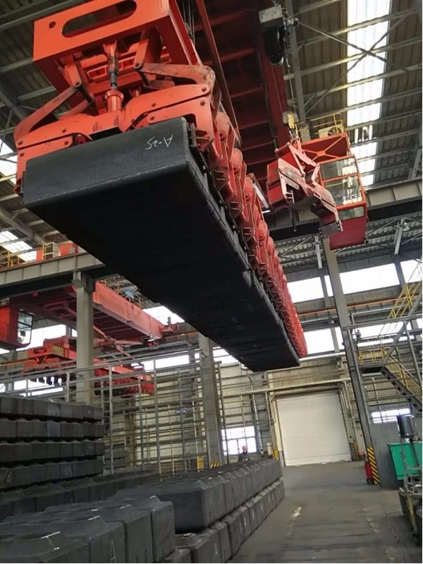 本產(chǎn)品通過自動夾鉗,每次可夾取21塊陽極碳塊,***高可堆成8層。橋架下面裝有工字鋼,工字鋼上裝有5t電動葫蘆,該葫蘆沿工字鋼運行,可通過單塊自動碳塊夾鉗夾取碳塊,還可在車間吊運零星雜物。運行和起升全部采用變頻調(diào)速,全部操作均可在操縱室內(nèi)完成。采用機械重力式自動夾取代替氣動方式夾取碳塊,為制造廠和用戶大大節(jié)約了成本。